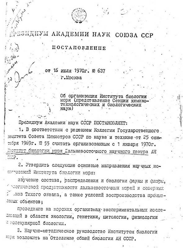 Остановимся на основных исторических событиях, сопутствовавших образованию и становлению Института в системе Российской академии наук. Одновременно с Институтом была создана морская биологическая станция «Восток» (зал. Восток Японского моря), через год биостанции «Радуга» на оз. Азабачье (Камчатка) и «Сокол» на р. Белая (Сахалин), еще через год биостанция «Старк» на о-ве Попова. Немногим позднее к ним были добавлены Государственный природный комплексный морской заказник «Залив Восток», биостанция «Запад», собственные Водолазная, Аквариальная и Морская службы. Для сохранения и изучения уникальных прибрежных сообществ залива в 70-х годах прошлого века в Хасанском районе был организован первый в стране Морской заповедник (ныне Дальневосточный морской биосферный государственный природный заповедник, с 2021 года находящийся под управлением ФГБУ «Земля Леопарда»).