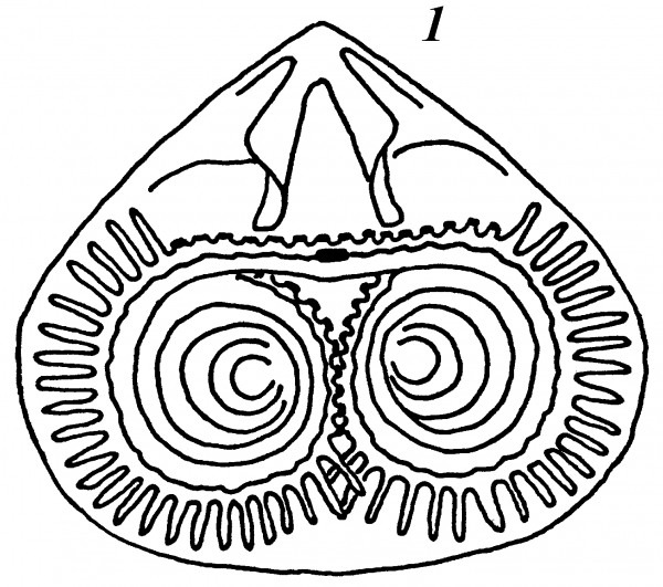 Description. Shells are up to 30 mm in length, from grayish-brown to black, they are triangular in plan with rounded anterior margin, the outer surface has thin radial stripes, pores are absent, shells of young specimens are hemitranslucent. Anterior commissure is uniplicate (convex to brachial valve). Crura reach ¼ length of brachial valve, they are flat and each of them is reinforced with oblique rib from sides to the centre of the shell. Two spirals of lophophore (up to 5 turns in each) are forming cones with tops directed to brachial valve and slightly inclined to the middle line of shell. There are no spicules in soft tissues.