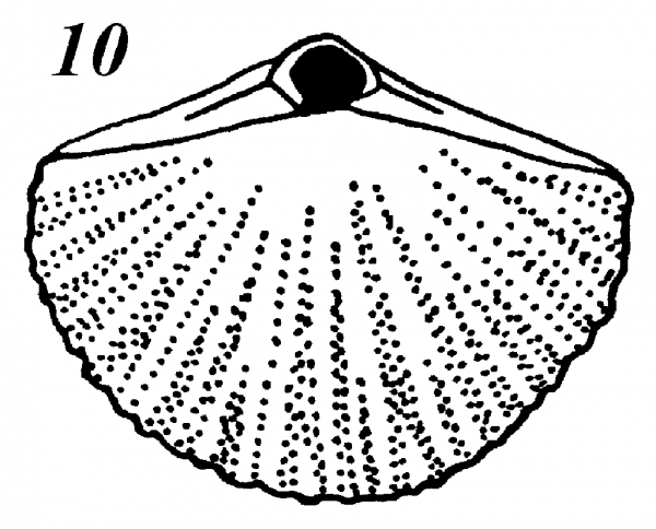 Описание. Крупные груборебристые раковины, изменчивые по форме: от округлой или почти пятиугольной до полукругло-треугольной, от продолговатой до поперечно вытянутой. Замочный край прямой или слабовыгнутый, его длина больше или меньше ширины раковины. Клюв короткий почти прямой, форамен большой поперечно-овальный, дельтидиальные пластины треугольные, не сросшиеся, почти всегда разрушенные. Боковые грани клюва хорошо выражены, образуя треугольную почти плоскую арею. Резкие радиальные ребра раздваиваются у края раковины, на ребрах хорошо видны следы нарастания, подчеркнутые интенсивно-розовой окраской на общем желтоватом фоне раковины. Кардинальный отросток узкий поперечный, замочная платформа слита со срединной септой, которая у молодых особей достигает середины створки, но с возрастом редуцируется. Свободная петля взрослых особей простирается на четыре пятых длины брахиальной створки.