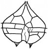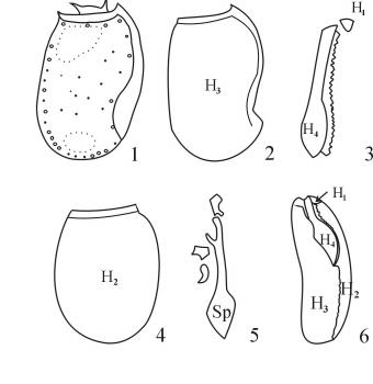 Sinophysis grandis: схема строения рода Sinophysis на примере S. grandis (1а-д) (по: Selina, Hoppenrath, 2004), правая (1а) и левая (1б) боковые пластинки; строение клетки с брюшной стороны (1в), правая (H4) и левая (H1) брюшные пластинки (1г) , брюшные пластинки (1д), общий вид клетки справа (1е)