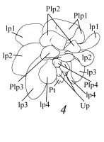 Оостегит 1: передняя сегмент овальный, задний сегмент на короткой стороне почти прямоугольной формы, с прямым медиальным краем, постеролатеральный угол оттянут в небольшую закругленную лопасть; на длинной стороне медиальная часть заднего сегмента вытянута в овальную лопасть. Оостегиты 2-4 на длиной стороне очень большие, оостегит 5 отсутствует; на короткой стороне оостегиты маленькие, редуцированные, не участвуют в формировании выводковой сумки, каждый разделен поперечной складкой на два сегмента. Передний сегмент оостегита 2 на длинной стороне имеет форму сидящей на массивном основании, чашевидно вогнутой ромбовидной лопасти, которая нависает над передним краем головы; вентральный край переднего сегмента покрыт бугорками. Переоподы 1-7 на короткой стороне и 1-2 на длинной сходной формы, длина переоподов 1-7 на короткой стороне уменьшается от передних к задним; на длинной стороне переоподы 3-4 отсутствуют, рудименты переоподов 5-7 сохраняются на вентральной стороне у границы с плеоном в виде маленьких дистально раздвоенных выростов. Плеоподы 1-4 на длинной стороне широкие, каждый разделен продольной складкой на две лопасти; плеоподы 1-4 на короткой стороне значительно меньше, чем на длинной, трапециевидные, с широким прямым дистальным краем; плеотельсон с парой рудиментарных коротких ланцетовидных уроподов.