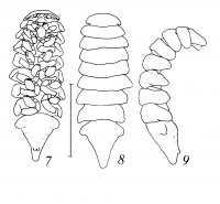 Переонит 4 в не менее чем в 1.5 раза длиннее переонита 3; переониты 1 и 2 примерно равной длины, длина остальных переонитов незначительно возрастает по направлению к переониту 4; переонит 1 отчетливо отграничен от головы глубоким поперечным вдавлением, переходящими по бокам в глубокие, узкие вырезки. Коксальные пластинки 2-4 очень маленькие, узкие, не видны сверху, 5-7 широкие, округло-треугольной формы. Длина плеона составляет примерно 0.3 длины тела; плеониты 1 и 2, составляют 0.2 длины плеона; плеотельсон у основания с парой широких закругленных латеральных отростков, передняя широкая часть плеотельсона сильно выпуклая, составляет 0.8 его длины, ясно отграничена от задней узкой части; задний конец задний конец незначительно оттянут назад, с неглубокой округлой медиальной вырезкой