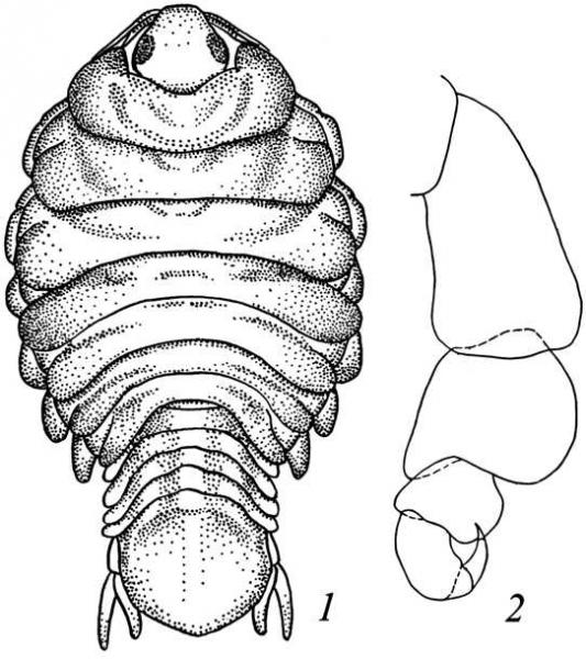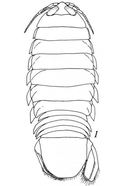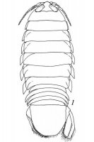 Описание. Длина взрослой самки примерно в 1.7 раза превышает наибольшую ширину на уровне 3 переонита. Голова маленькая, наполовину погружена в переонит 1, ширина немного превосходит длину; рострум слабо развит, округло-усеченный. Глаза небольшие, овальные, расположены по бокам головы, занимают менее половины ширины головы. Коксальные пластинки узкие, не достигают заднего края соответствующего переонита, их ширина увеличивается от 2 к 7; заднебоковые углы закруглены. Ширина плеона составляет 0.5 ширины переонита 4; боковые части плеонитов 1-2, иногда и 3 прикрыты сверху краями переонита 7. Плеотельсон уже, чем плеониты, его ширина примерно равна длине, задний край закруглен; дорсальная поверхность плоская или слабо выпуклая, иногда со слабо выраженным продольным медиальным килем.