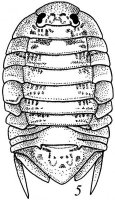 Описание. Длина тела примерно в 2.5 раза превосходит ширину. Голова треугольная, ширина в 2-2.7 раза превышает длину; фронтальная часть выдается вперед за основания антенн. Глаза большие, овальные, разделены расстоянием, примерно равным ширине глаза. Переонит 1 самый длинный. Коксальные пластинки 6 видны сверху, 2-5 и 7 могут быть не видны; постеролатеральные углы коксальных пластинок 1-3 закругленные, пластинок 4-7 – вытянутые назад и заостренные. Плеониты 1-4 примерно равной длины, постеролатеральные углы плеонитов 2-4 вытянуты назад и заострены; плеонит 5 заметно длиннее и уже плеонитов 2-4, его боковые края усеченные. Плеотельсон составляет 0.2 длины тела, в основании шире чем плеонит 5, полуовальный, ширина в 1.2 превышает длину, с закругленным зазубренным задним краем, покрыт грубыми волосками, у основания вдавлен по бокам приподнимающейся середины.