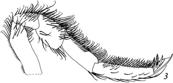 Мужской отросток переопода 2 шиловидно сужен дистально, почти достигает дистального края эндопода.