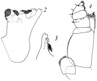 Антенна 1: членик 2 по длине равен членику 1, но в почти в 2 раза уже, членик 3 крошечный. Антенна 2 составляет 0.75 длины тела; соотношение длин члеников стебелька: 1:1.2:2.1:4.2:6.4; жгутик примерно в 2 раза длиннее членика 5 стебелька, содержит около 23 члеников. Мандибулы: режущий край с 3 зубцами; подвижная пластинка на левой мандибуле с 3 зубцами, на правой – в форме короны; в зубном ряду около 13-15 перистых щетинок; зубной отросток нормально развит. Максилла 1: внутренняя лопасть с 2 большими и 2 меньшего размера перистыми щетинками; наружная лопасть с 8 крепкими щетинками. Длина базиса ногочелюстей в 1.5 раза превосходит ширину; эндит достигает края членика 2 щупика, с 12 крепкими щетинками и 1 перистой щетинкой; эпипод составляет 0.4 длины базиса; щупик равен 0.8 длины базиса, 5-члениковый, соотношение длин члеников 1:2.2:1.3:1.4:0.8, медиальный край покрыт короткими щетинками.