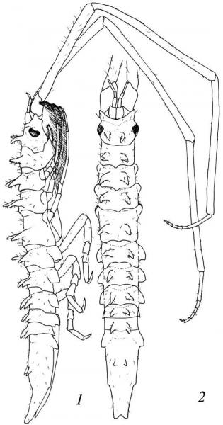 Переописание. Длина тела в 2.5 раза превышает ширину; дорсальная поверхность мелкозернистая, почти гладкая. Голова на 0.2 длины погружена в переонит 1, ширина в 2.2 раза превосходит длину, передний край закруглен, задний почти прямой, постокципитальная часть отделена поперечной бороздой, более глубокой по краям; фронтальная и супраантеннальная линии ясно выражены, первая полукруглой формы, последняя образует V-образный изгиб над антеннами 1. Глаза большие, черные, сердцевидные, занимают почти всю боковую поверхность головы. Переон составляет 0.6 длины тела; переониты почти равной длины, слегка укорачиваются от передних к задним; коксальные пластинки сливаются с соответствующими переонитами со следами слияния в виде легких бороздок; антеролатеральные углы переонита 1 вытянуты в треугольные отростки, охватывающие голову с боков, постеролатеральные углы переонита 1 почти прямые, переонитов 2-3 тупо заострены, 5-7 – оттянуты назад и заострены. Плеон уже переона, длина плеонитов постепенно возрастает от передних к задним; боковые края плеонитов 1-2 не достигают боковых краев тела; эпимеры плеонитов 3-5 большие, плоские, отогнуты назад и заострены; ширина плеотельсона в 1.6-1.8 раза превосходит длину, позади постеролатеральных отростков края плеотельсона образуют по паре зубцов: латеральный низкий и сглаженный, медиальный более острый, позади зубцов края плеотельсона сходятся, образуя тупой угол.