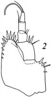 Антенна 1: жгутик 5-члениковый, с 3 эстетасками; антенна 2: жгутик 7-члениковый. Мандибулы чуть короче 0.5 длины головы, изогнуты внутрь и вверх; киль невооруженный, заканчивается неясно выраженным уступом; вблизи дистального конца киля мандибулярная щетинка; режущий край слегка волнистый, почти гладкий, незначительно аркообразно изогнут. Пилопод 3-члениковый, членик 1 с 3 ареолами, вентральная сторона в дистолатеральной части усажена простыми щетинками, членик 2 с 2 дистальными щетинками, членик 3 крошечный, наполовину скрыт за дистальным краем членика 2. Переоподы крепкие, несут длинные перистые щетинки, вдоль дорсальной стороны базисов всех переоподов, кроме переопода 2, продольный ряд бугорков; переопод 4 мощнее остальных, базис несет крупные дорсальные и вентральные бугры, из которых один, дистальный, в переднебоковой области, в виде шпоровидного отростка, исхиум с 1 шпоровидным отростком и 2 вентральными буграми, мерус с 2 шпоровидными отростками, карпус с 2 вентральными уплощенными отростками треугольной формы. Плеоподы: протоподы с 2 ретинакулами, ветви с перистыми маргинальными щетинками, мужской отросток плеопода 2 немного не доходит до середины эндопода. Эндоподы уроподов немного длиннее и в 2 раза шире экзоподов, слегка выдаются за задний конец плеотельсона.