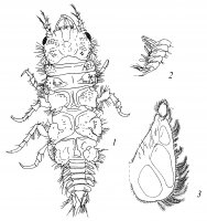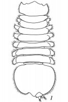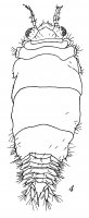Описание. Самец. Тело заметно расширяется кзади, длина в 2 раза превосходит ширину на уровне плеотельсона. Дорсальная поверхность, особенно плеотельсона, покрыта редкими тонкими щетинками; боковые края головы, переонитов, плеотельсона и вершины выростов коксов с игловидными щетинками. Голова: ширина примерно в 2 раза превосходит длину по медиальной линии, латеральные лопасти хорошо развиты, их передние углы оттянуты вперед в треугольные выросты с закругленной вершиной; фронтальный край с округлыми антеннальными вырезками, разделенными округло-треугольными выростами, рострум широко треугольный, тупо заострен, слегка выдается за края переднебоковых выростов головы.