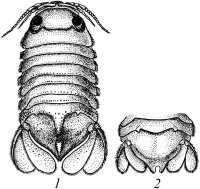 Плеотельсон суживается кзади, ширина в передней трети примерно в 1.2-1.4 раза превосходит длину; постеролатеральные углы оттянуты назад в виде тупо заостренных треугольных лопастей; вырезки в местах причленения уроподов широкие, полукруглые; медиальная лопасть широкая, закругленная, приметно такой же длины, как постеролатеральные.