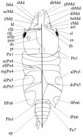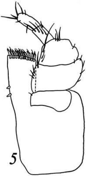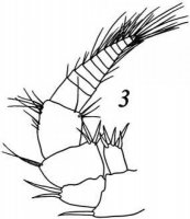 Антенна 1: длина членика 1 стебелька примерно в 1.3 раза превосходит ширину; жгутик 8-12-члениковый. Антенна 2 достигает заднего края переонита 7, у молодых самцов короче. Внутренняя лопасть максиллы 2 чуть короче медиальной и наружной. Мандибула: дистальный край зубного отростка с 1 щетинкой; режущий край с 5 зубцами; подвижная пластинка с 5 зубцами; в зубном ряду левой мандибулы 5, правой – 6 щетинок. Ногочелюсти нормального строения: членики 3-5 щупика составляют примерно 0.6 длины щупика, длина членика 3 составляет примерно 0.5 ширины.