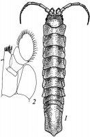 Антенны 1 отогнутые назад, немного заходят за задний край переонита 1, их основания разделены соприкасающимися между собой ростральным отростком и щитком; членик 1 стебелька удлиненный, сильно расширен; жгутик 8-12-члениковый. Антенна 2 достигает заднего края переонита 4; жгутик 10-15-члениковый. Внутренняя пластинка ногочелюстей с 1 ретинакулой, наружные края члеников 2-4 щупика несут щетинки по формуле 1:3:3.