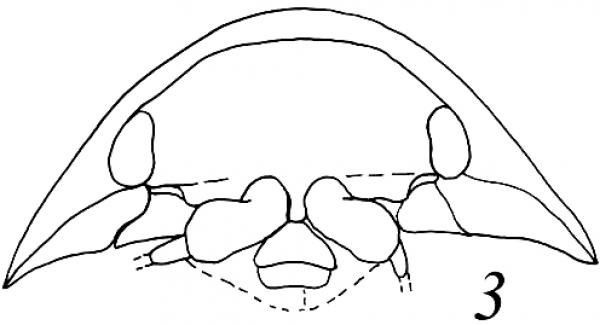 Описание. Тело умеренно выпуклое, боковые края почти параллельные, длина в 1.5-1.9 раза превосходит наибольшую ширину на уровне переонита 4. Голова короткая, ширина примерно в 2.5 раза превосходит длину, заметно суживается кпереди, больше чем наполовину погружена в переонит 1; ростральный отросток узкий, длинный, слегка сужен в основании, конец закруглен; фронтальный край сильно извилистый, по бокам от рострального отростка по глубокой округлой антеннальной вырезке, латеральнее которой еще 2 вырезки меньшего размера; задний край головы прямой. Щиток треугольной формы, с закругленными боковыми углами и округло-усеченной вершиной. Глаза большие, слабо выпуклые, почковидные, в спирте черные.