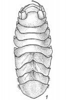 Описание. Самец. Тело овальное, сводчатое, длина в 2.2-2.4 раза превосходит ширину на уровне переонита 4. Дорсальная поверхность головы, переона и плеонитов 1-2 с округлыми бугорками, образующими на переонитах по 2, а на плеонитах 1-2 по 1 поперечному ряду. Голова до основания латеральных лопастей погружена в переонит 1, ширина в 1.8 раза превосходит длину; антеролатеральные лопасти хорошо развиты, с закругленным краем; медиальная лопасть широко закругленная, с небольшой медиальной выемкой. Глаза умеренного размера, черные, содержат 8-9 омматидиев. Переон составляет 0.7 длины тела; переониты примерно равной длины; антеролатеральные углы переонита 1 вытянуты в закругленные отростки, охватывающие голову с боков, постеролатеральные углы переонитов 2-7 тупо заострены, на переонитах 5-7 оттянуты назад; коксальные пластинки сливаются с соответствующими переонитами, у яйценосных самок пластинки 2-4 отделены едва заметным швом. Плеониты примерно равной длины; боковые края плеонитов 1-2 прикрыты сверху плевральными расширениями переонита 7; эпимеры плеонитов 3-5 короткие, оттянуты назад и заострены. Плеотельсон трапециевидной формы, с усеченным или слегка закругленным задним краем.