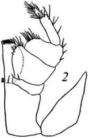 Антенна 1: членик 1 расширен в основании, ширина в 1.25 раза превосходит длину; жгутик 8-члениковый. Зубной отросток мандибулы короткий и толстый, незначительно суживается дистально; зубной ряд левой мандибулы содержит 4 крепкие щетинки; щупик слегка короче длины тела мандибулы, тонкий, членик 2 в 2.4 раза длиннее членика 1, членик 3 самый короткий. Эпипод ногочелюстей составляет 0.6 длины базиса, примерно треугольной формы – значительно расширяется к почти прямому дистальному краю; внутренняя пластинка с 4 ретинакулами; членики 2 и 3 щупика очень большие, шире базиса, членик 4 с длинной дистомедиальной лопастью, равной 0.6 длины членика 5.