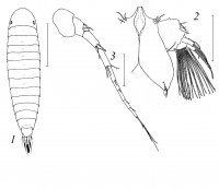 Антенна 1 с 8-9-члениковым жгутиком. Антенна 2 равна по длине телу, у молодых самцов короче тела. Мандибула с 5-6 щетинками в зубном ряду. Лопасти максиллы 2 примерно равной длины. Ногочелюсти нормального строения: членики 3-5 щупика составляют примерно 0.6 длины щупика, длина членика 3 составляет примерно 0.5 ширины.