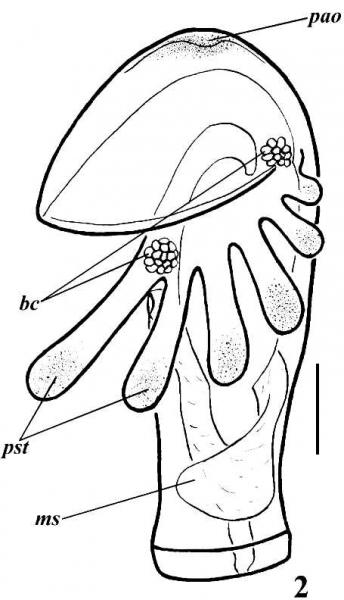 Диагностические признаки. Личинки прозрачные, пигментация появляется у личинок на стадии 6 щупалец. Два первых скопления пигмента располагаются с обеих сторон аборального органа, позднее появляется пигмент на концах щупалец. Длина тела составляет 1-1,2 мм, максимальное число щупалец 12. Печеночный вырост непарный. Имеется три скопления эритроцитов: два с каждой стороны печеночного выроста ( в местах соединения эпи- и гипосферы) и одно вентральное. Зачатки дефинитивных щупалец представлены в виде утолщения эпителия в основании личиночных щупалец. Фронтальный орган отсутствует.