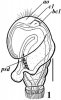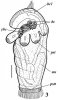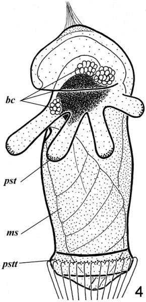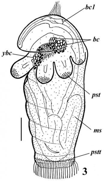 Описание.Наиболее ранние стадии личинок этого вида были отмечены в планктоне залива Восток в июне-июле. Молодые личинки имеют прозрачные покровы эписферы и полупрозрачные – гипосферы. Длина тела достигает 300 мкм, высота эписферы составляет половину длины тела (150 мкм). На этой стадии имеются два медиальных щупальца и два зачатка латеральных щупалец, которые имеют вид бугорков на щупальцевом валике. В утолщенной эктодерме на концах щупалец залегают скопления мелких темных пигментных пятнышек, которые заметны только под микроскопом и поэтому не отнесены нами к определительным признакам. В эпителии вентральной стенки желудка залегает скопление темно-коричневых пятен, которое хорошо заметно у живых актинотрох под бинокуляром. Прозрачные покровы эписферы позволяют видеть утолщенную эктодерму аборального органа, обширную область протоцеля, расположенную под аборальным органом, и заднюю стенку протоцеля. Так как область протоцеля ограничена септой только с одной стороны, то личинок этого вида следует относить к роду Phoronis.