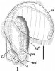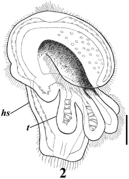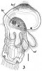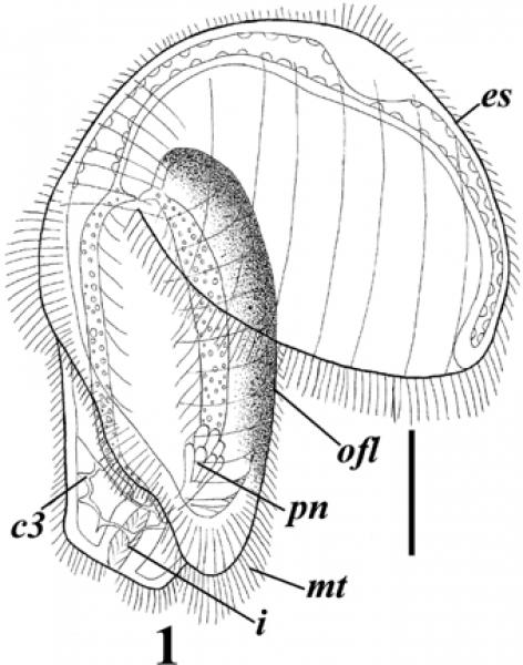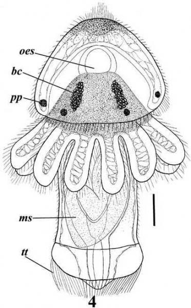 Описание. Только что оторвавшиеся от скоплений эмбрионов личинки имеют в длину 180-220 мкм. Диаметр эписферы (до 180 мкм) лишь немного уступает длине самой личинки. Имеется прототрох и метатрох, телотрох не выражен. Посторальный ресничный шнур идет по поверхности щупальцевого валика, на котором заметны утолщения, соответствующие двум парам личиночных щупалец, из которых вентральная пара обозначена более явственно, чем латеральная. Имеется характерная окраска черного цвета на протяжении участка брюшной стороны тела ото рта до щупальцевого валика (оральное поле). Апикально на эписфере располагается пучок ресничек, подостланный утолщением эктодермы дорсальной стороны головной лопасти - зачаток аборального нервного ганглия.