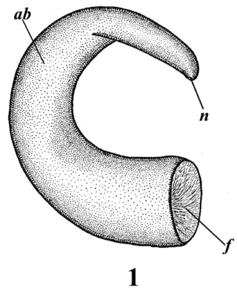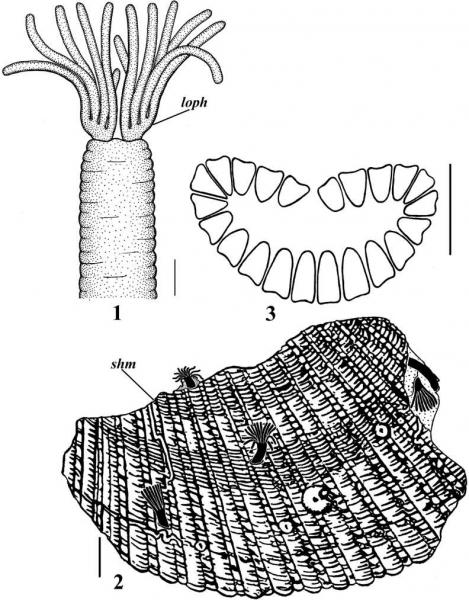 Описание. Мы приводим описание форонид, обнаруженных в зал. Анива, в скобках даны показатели тех же признаков по описанию Эмига (Emig, 1979). Длина тела составляет 5 (4-15) мм, диаметр 0,1 (0,15-0,35) мм. Цвет животного в фиксированном состоянии коричневатый (в живом состоянии прозрачный или желтоватый, часто по телу и щупальцам разбросаны белые пятнышки). Лофофор овальный, число щупалец составляет 30 (11-28), их длина 0,7 (0,3-1,2) мм. Гигантские нервные волокна отсутствуют, однако иногда присутствуют и левое и правое нервные волокна диаметром 2-5 мкм. Туловищный целом характеризуется отсутствием латеральных мезентериев. Продольная мускулатура кустистого типа, мышечная формула имеет следующий вид: