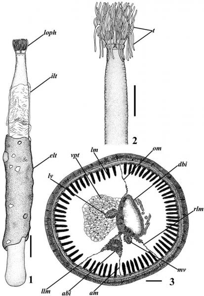 Описание. Длина тела со щупальцами 12,3 мм, диаметр 0,5-1,1 мм. Цвет живых особей светло-желтый. Лофофор подковообразный, либо переходный к спиральному с 0,5 оборотов, число щупалец 80-120 их длина 0,7 мм. Гигантских нервных волокна два: левое диаметром 9-10 мкм, правое - тонкое, исчезающее на некоторых срезах, диаметром 4-5 мкм. Продольные мышцы имеют кустистую форму. Мышечная формула имеет следующий вид: