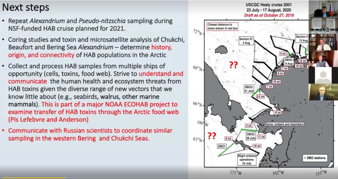 22 марта 2021 года было проведено видеосовещание между сотрудниками Лабораторий, где были обсуждены пути получения и обмена данными в рамках совместного проекта по изучению токсичных динофитовых водорослей рода Alexandrium в планктоне и бентосе Чукотского и Берингова морей, а также у побережья Камчатки. Идея данного проекта возникла в результате обсуждения общих проблем, связанных с Вредоносными цветениями водорослей в Северной Пацифике, на Морском Симпозиуме Аляски в январе 2021 г. https://alaskamarinescience.org/