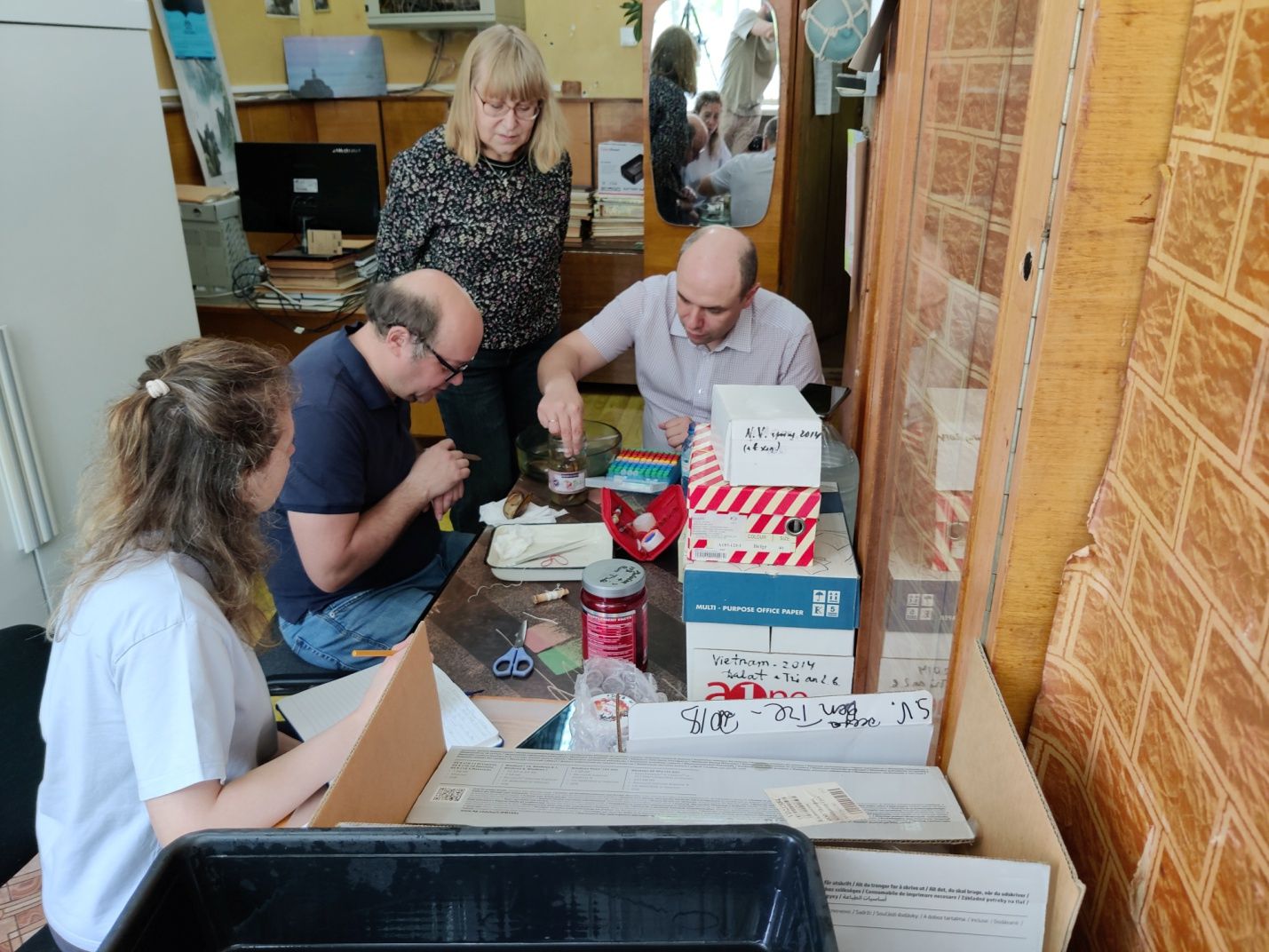 Рис. 2. Просмотр коллекции моллюсков и пиявок, собранных в разных районах Вьетнама в 2012- 2019 гг.: Е.С. Коноплёва, И.Н. Болотов, Л.А. Прозорова, А.В. Кондаков.