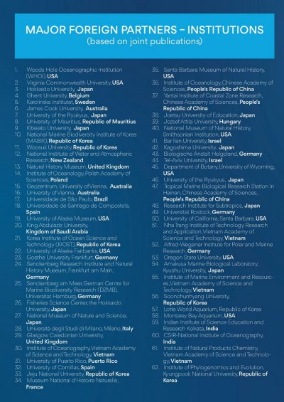An important achievement of intensive international collaboration is our joint publications: since 1970 the staff members of NSCMB have published more than 900 scientific articles with foreign coauthors from 48 countries, included into the Web of Science database (over 160 from USA, over 130 from Japan, and over 100 from Germany); more than 800 articles were included in the base SCOPUS. Only in the last decade, several joint monographs were published with scientists from Vietnam, China, Japan, Canada, and the Republic of Korea (Dr. Eduard A. Titlyanov, Dr. Andrey B. Imbs, Ph.D. Konstantin A. Lutaenko).