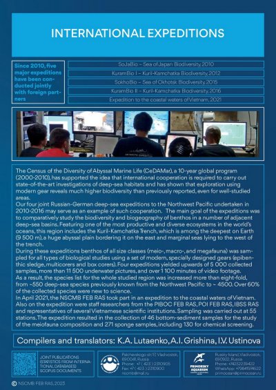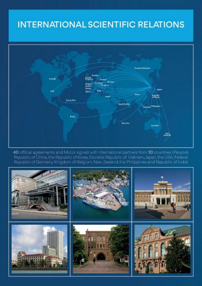 Since the establishment of the Institute of Marine Biology, FESC AS USSR in 1970 now A.V. Zhirmunsky National Scientific Center of Marine Biology FEB RAS, the scientific staff of the institute has been developing international scientific collaboration. In 1970-1980, the Institute conducted successful marine and coastal expeditions in the western Pacific and Indian oceans with participation of scientists from Vietnam, Australia, USA and other countries. Since 2010, regular joint Russian-German cruises are conducted for studying deep sea biota in the North Pacific. In 1974, the first Soviet-Japanese symposium in biology of marine mollusks and echinoderms was held in Nakhodka, in 1979 the scientists of IMB took an active part in the 14th Pacific Science Congress in Khabarovsk and organized several sections of the Congress. A series of Soviet-Vietnamese meetings in marine biology were held in 1980, and joint proceedings of articles were published. During the USSR period, many prominent foreign scientists, as J. G. Crisp, Otto Kinne, J.D. Costlow, Thor Heyerdahl , Tadashige Habe, Ruth Turner, J.-M. Peres and others visited the marine biological station “Vostok”, actively contributing to successful development of research work there. In 1990s, the intensity of international collaboration increased and became almost global at the level of personal relations of scientists, but with the most intensive inter-institutional relations arose between NSCMB and institutions of the Federal Republic of Germany (the Naturmuseum Senckenberg, a museum of natural history, Senckenberg World of Biodiversity), the Republic of Korea (National Marine Biodiversity of Korea, MABIK; Korea Institute of Ocean Science and Technology, KIOST), the People's Republic of China (Institute of Oceanology, Chinese Academy of Sciences, IOCAS) and the Socialist Republic of Vietnam (Institute of Oceanography, Vietnam Academy of Science and Technology).