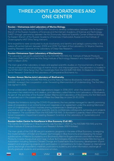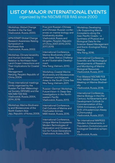 In 2019-2020, the NSCMB FEB RAS carries out 41 international agreements with 10 countries (China, Republic of Korea, Vietnam, Japan, USA, Germany, Belguim, Ukraine, New Zeeland, and Philippine). Four joint “open” laboratories (Russian-Vietnamese and Russian-Korean laboratories) successfully work under the leadership of PhD. Andrey B. Imbs, PhD. Tatyana N. Dautova, and PhD. Konstantin A. Lutaenko. The National Scientific Center is developing active collaboration with a number of international organizations, in particular, scientists of the Center have become members of different committees and commissions in the Asia-Pacific Network for Global Change Research (APN), in the Action Plan for the Protection, Management and Development of the Marine and Coastal Environment of the Northwest Pacific Region (NOWPAP), in the North Pacific Marine Science Organization (PICES), UNESCO and etc. Various international conferences are actively carried out in the NSCMB: the Far Eastern Malacological Society (led by Dr. Konstantin Lutaenko) organized three international meetings (2004, 2014, and 2019); geneticists have carried out 10 international symposiums (Modern Achievements in Population, Evolutionary, and Ecological Genetics – MAPEEG); the conference Cell Cultures of Marine and Freshwater Animals was held in 2015); since 1990s, there occurred a series of international meetings on the problem of global changes in natural environment and climate; five joint Russian-Chinese conferences on marine biology and biodiversity were organized in 2007, 2010, 2012, 2017, and 2019; a series of Russian-German meetings on deep sea biology, international conference on nematology and other events in the Center were actively attended by our international research partners.