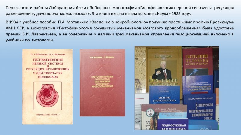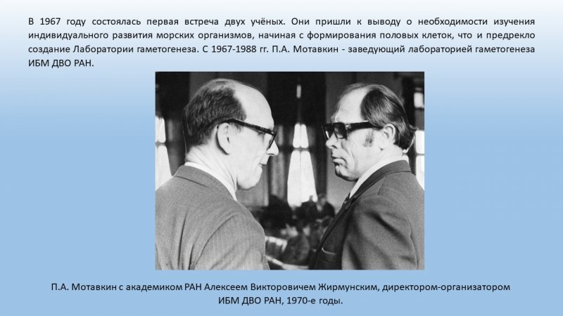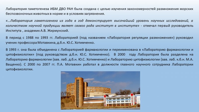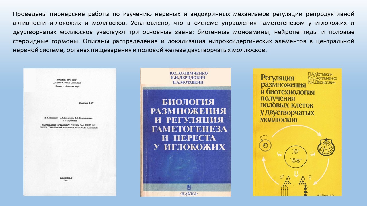В ИБМ ДВО РАН под руководством П.А. Мотавкина начаты исследования закономерностей размножения морских беспозвоночных в норме и в условиях загрязнения. За прошедшие годы были описаны гаметогенез и половые циклы у массовых и коммерчески ценных видов иглокожих и двустворчатых моллюсков зал. Петра Великого Японского моря. Исследованы сезонные изменения в нейросекреторной активности центральной нервной системы двустворчатых моллюсков. Проведены пионерские работы по изучению нервных и эндокринных механизмов регуляции репродуктивной активности иглокожих и моллюсков. Установлено, что в системе управления гаметогенезом у иглокожих и двустворчатых моллюсков участвуют три основные звена: биогенные моноамины, нейропептиды и половые стероидные гормоны. Описаны распределение и локализация нитроксидергических элементов в центральной нервной системе, органах пищеварения и половой железе двустворчатых моллюсков.