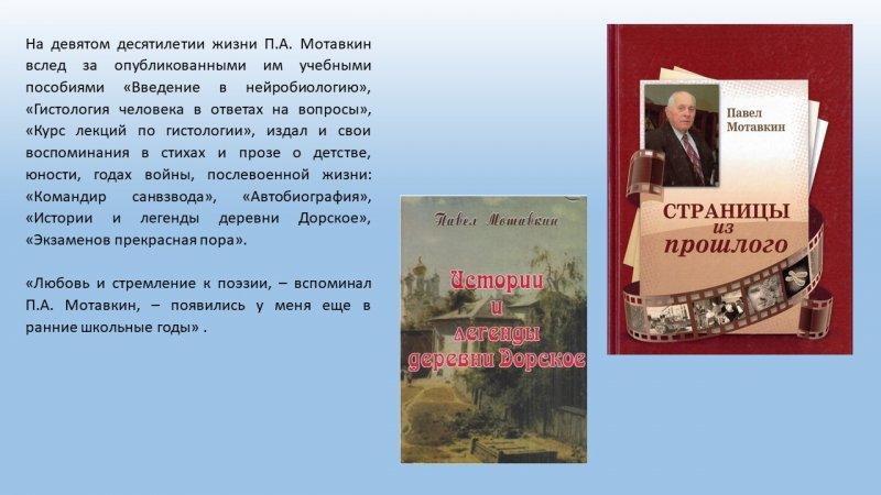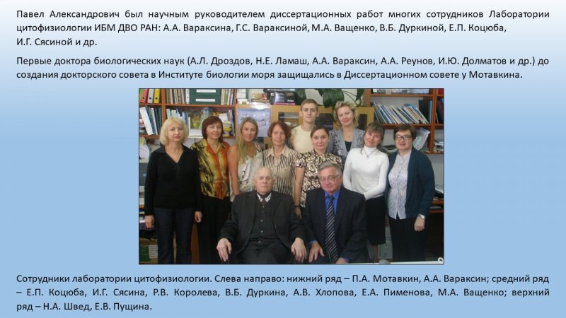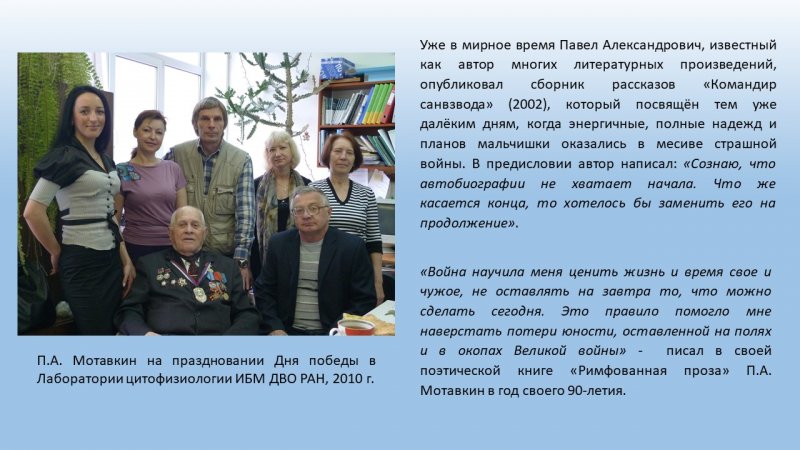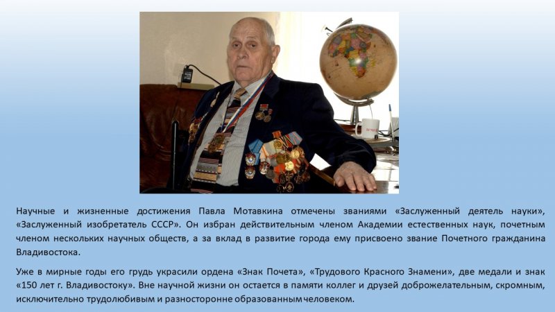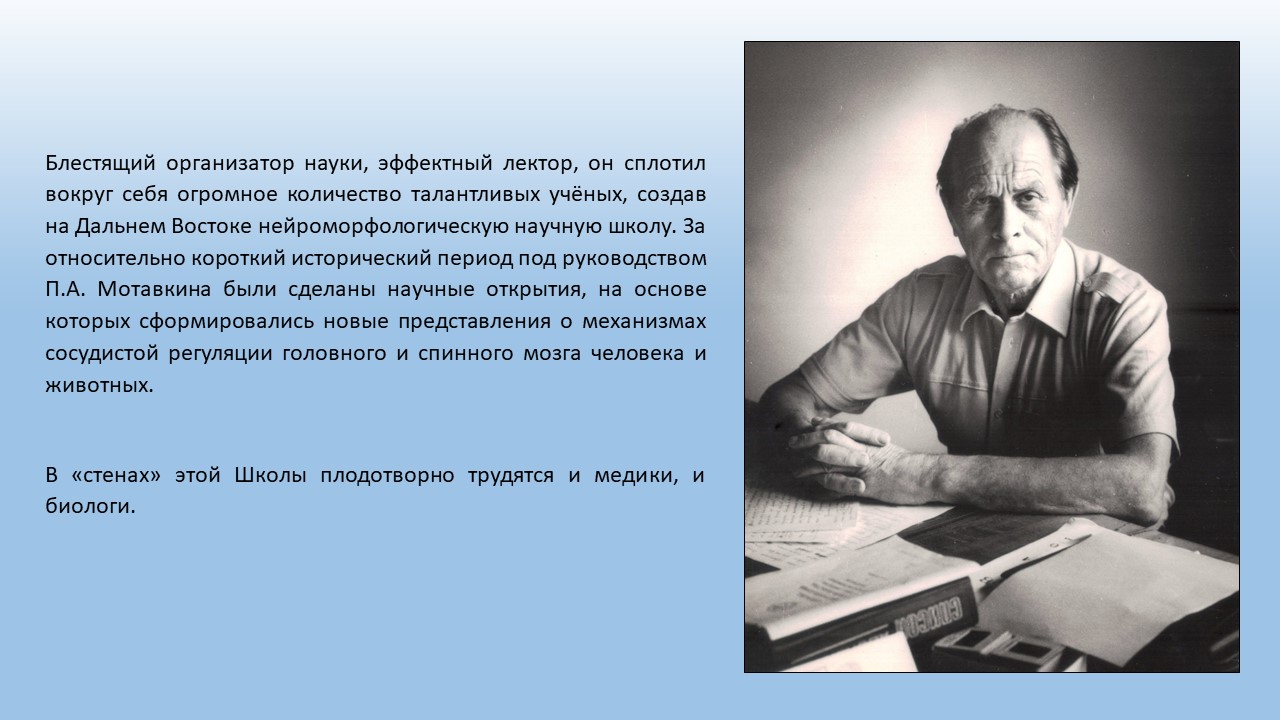 В июле 2022 г. исполняется 100 лет со дня рождения Павла Александровича Мотавкина (28.07.1922- 27.05.2015) - выдающегося нейроморфолога, доктора медицинских наук, профессора Тихоокеанского государственного медицинского университета (ТГМУ), главного научного сотрудника Института биологии моря ДВО РАН (ИМБ ДВО РАН, ныне ННЦМБ ДВО РАН), Заслуженного деятеля науки РСФСР, Заслуженного изобретателя СССР, Почётного гражданина города Владивостока.