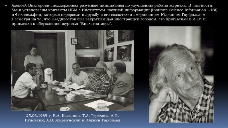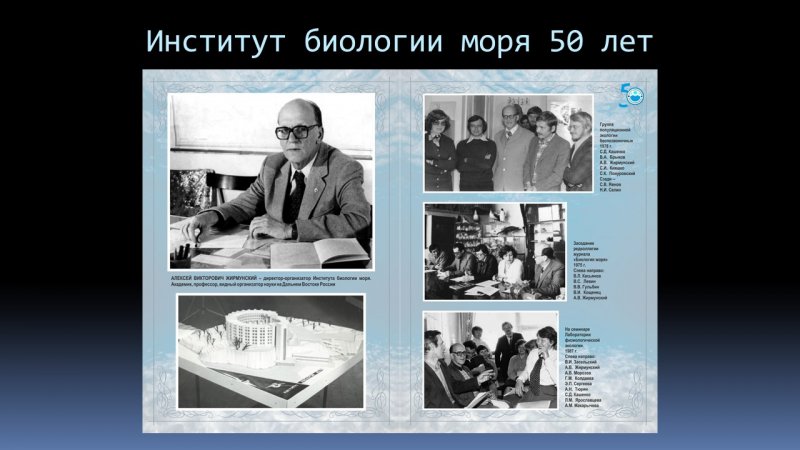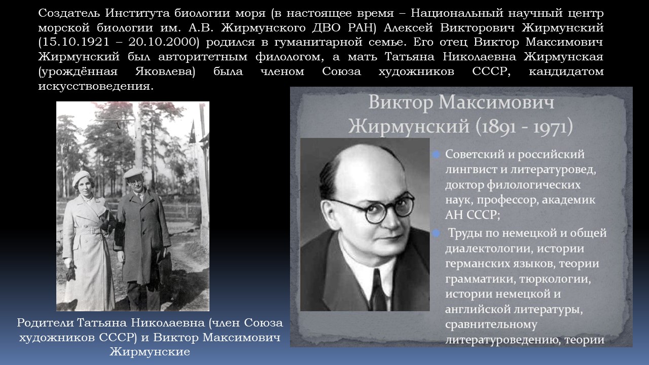 15 октября 2022 г. исполнилось 100 лет со дня рождения Алексея Викторовича Жирмунского - выдающегося учёного-биолога, доктора биологических наук, академика РАН, первого директора и организатора Института биологии моря ДВО РАН, участника Великой Отечественной войны.