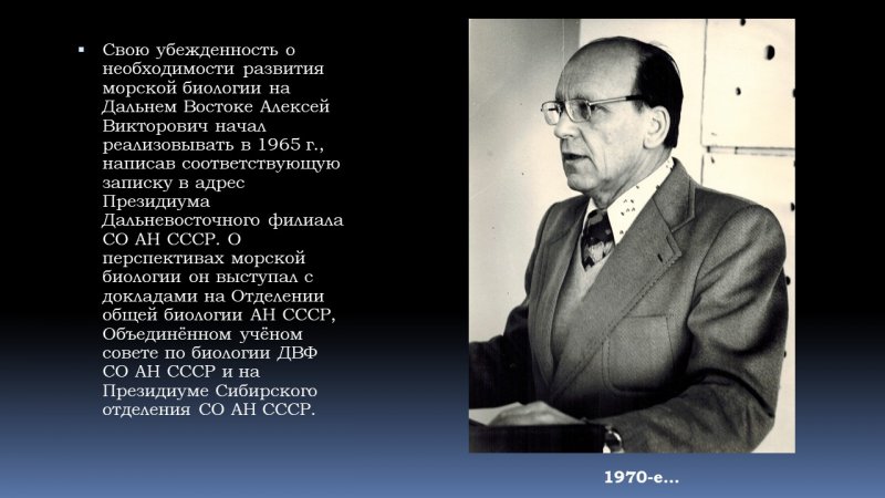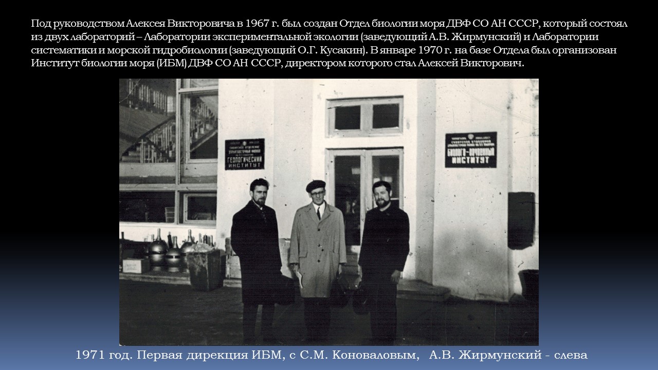 Свою убежденность о необходимости развития морской биологии на Дальнем Востоке Алексей Викторович начал реализовывать в 1965 г., написав соответствующую записку в адрес Президиума Дальневосточного филиала СО АН СССР. О перспективах морской биологии он выступал с докладами на Отделении общей биологии АН СССР, Объединённом учёном совете по биологии ДВФ СО АН СССР и на Президиуме Сибирского отделения СО АН СССР. В сентябре 1966 года Президиум Академии наук СССР принял решение об организации Отдела биологии моря в Дальневосточном филиале Сибирского отделения Академии наук СССР. В начале 1967 года Отдел биологии моря был создан в составе двух лабораторий (гидробиологии и экспериментальной экологии). Первые научные сотрудники будущего института приехали со всей страны - из Ленинграда, Москвы, Сухуми, Симферополя. В 1970 г. Отдел был официально преобразован в Институт биологии моря Дальневосточного научного центра Академии наук СССР.