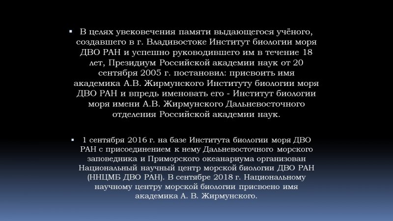 В целях увековечения памяти выдающегося учёного, академика Алексея Викторовича Жирмунского, создавшего в г. Владивостоке Институт биологии моря ДВО РАН и успешно руководившего им в течение 18 лет, Президиум Российской академии наук от 20 сентября 2005 г. постановил: присвоить имя академика А.В. Жирмунского Институту биологии моря ДВО РАН и впредь именовать его - Институт биологии моря имени А.В. Жирмунского Дальневосточного отделения Российской академии наук. 1 сентября 2016 г. на базе Института биологии моря ДВО РАН с присоединением к нему Дальневосточного морского заповедника и Приморского океанариума организован Национальный научный центр морской биологии ДВО РАН (ННЦМБ ДВО РАН). В сентябре 2018 г. Национальному научному центру морской биологии присвоено имя академика А. В. Жирмунского.