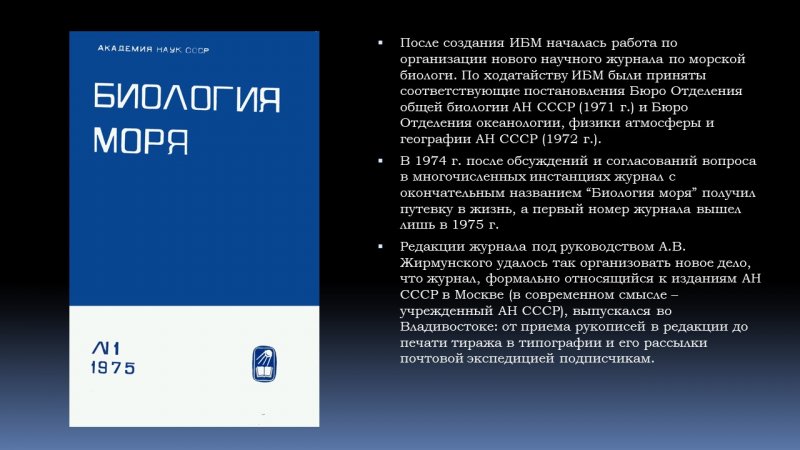 Сразу же после создания ИБМ началась работа по организации нового научного журнала по морской биологии. По ходатайству ИБМ были приняты соответствующие постановления Бюро Отделения общей биологии АН СССР (1971 г.) и Бюро Отделения океанологии, физики атмосферы и географии АН СССР (1972 г.); в 1975 году из печати вышел первый номер журнала «Биология моря».