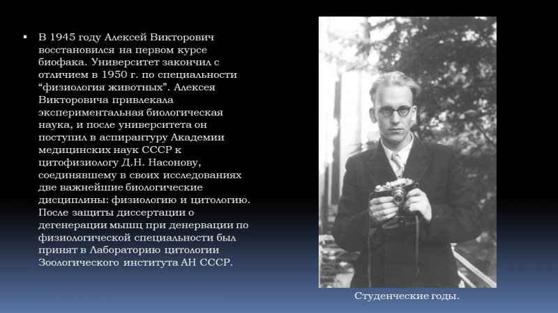 В 1939 г. Алексей Викторович поступил на биологический факультет Ленинградского университета. Студенческая жизнь его была прервана начавшейся Великой Отечественной войной, университет он закончил только в 1950 г. по специальности “физиология животных”. Алексея Викторовича привлекала экспериментальная биологическая наука, и сразу после окончания университета он поступил в аспирантуру Академии медицинских наук СССР к цитофизиологу Д.Н. Насонову, соединявшему в своих исследованиях две важнейшие биологические дисциплины: физиологию и цитологию. После защиты диссертации о дегенерации мышц при денервации по физиологической специальности был принят в Лабораторию цитологии Зоологического института АН СССР. Здесь начал формироваться интерес Алексея Викторовича к морской биологии.