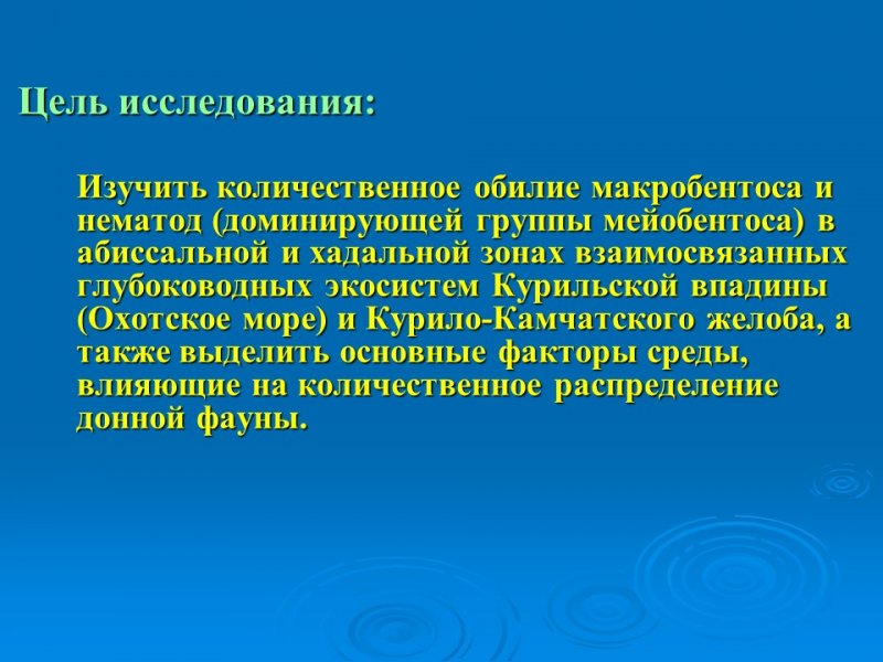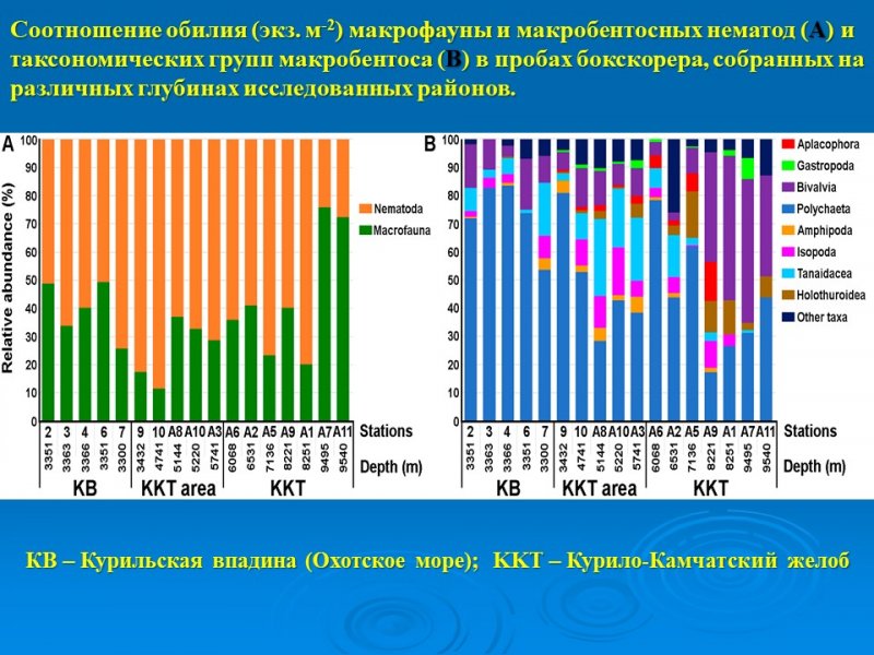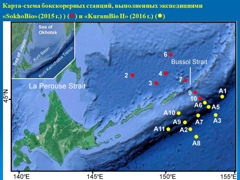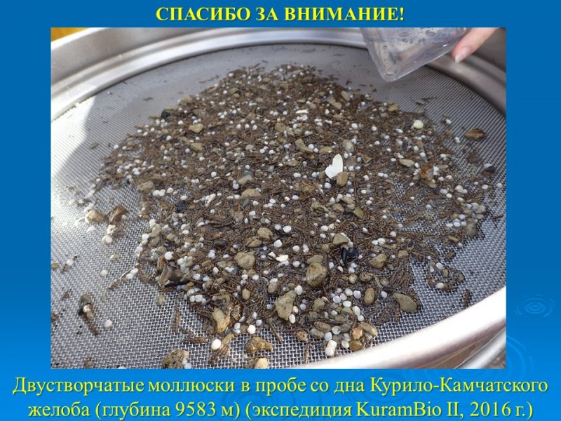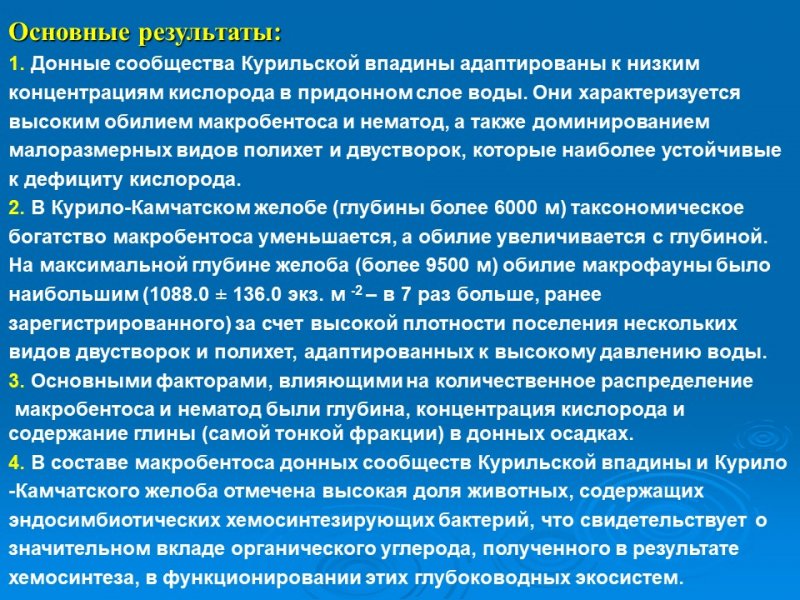 Не менее значимы результаты исследования самых глубоководных донных экосистем северо-западной Пацифики, представленные научными сотрудниками Лабораторий динамики морских экосистем и эмбриологии. Ими было показано, что на дне Курило-Камчатского желоба (глубина более 9500 м) количество донных животных оказалось в 7 раз выше, чем ранее было зарегистрировано. На количественное распределение донной фауны Курильской впадины (Охотское море) и Курило-Камчатского желоба наибольшее влияние оказали три параметра окружающей среды из 17, рассмотренных в данном исследовании. Также, было отмечено, что в функционировании глубоководных экосистем Охотского моря и Курило-Камчатского желоба большое значение имеет органическое вещество, полученное в результате хемосинтеза.