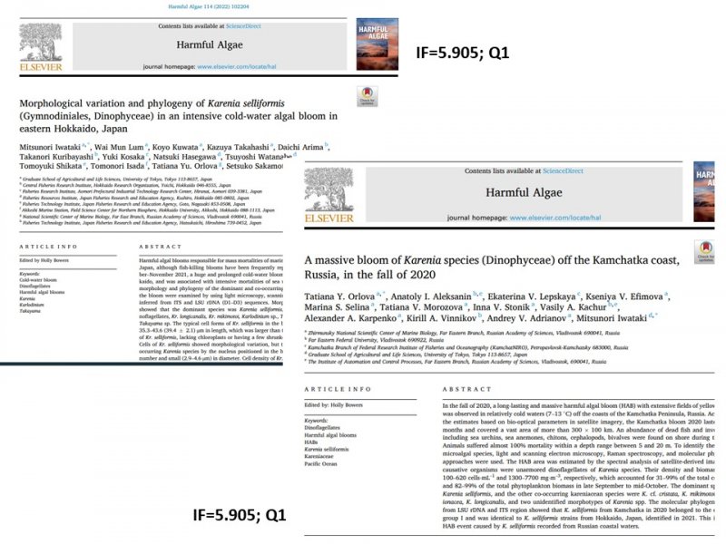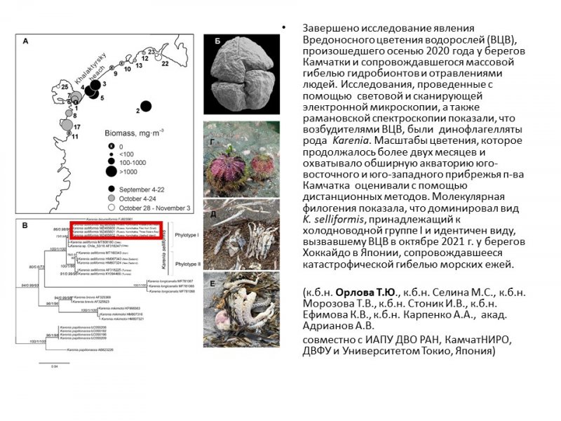 В 2022 г. специалисты Национального научного центра морской биологии им. А.В. Жирмунского ДВО РАН совместно с рядом научных организаций, в обобщающей статье подвели итог исследования вредоносного цветения микроводорослей рода Karenia у тихоокеанского побережья России (п-ов Камчатка) осенью 2020 года, сопровождавшегося катастрофической гибелью гидробионтов и отравлениями людей, контактировавших с морской водой. Эта ситуация впервые показала, каких масштабов может достигать вредоносное цветение микроводорослей в России. Основной целью дальнейших исследований ученых будет выявление механизмов, способствующих размножению, переносу и накоплению клеток рода Karenia, что поможет смягчить негативные последствия их вредоносного цветения.