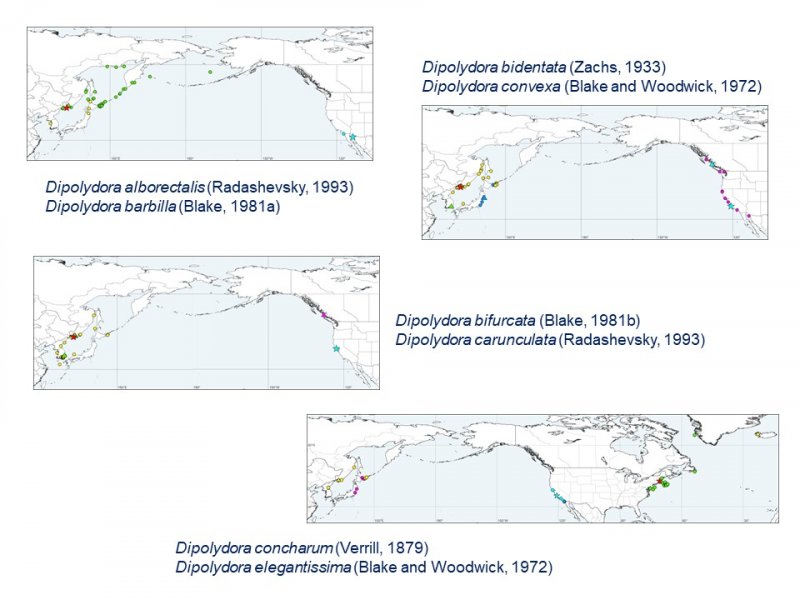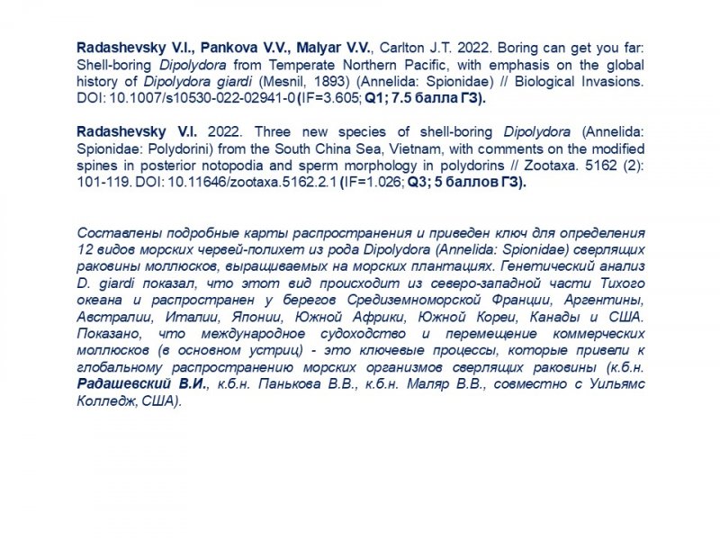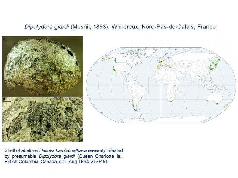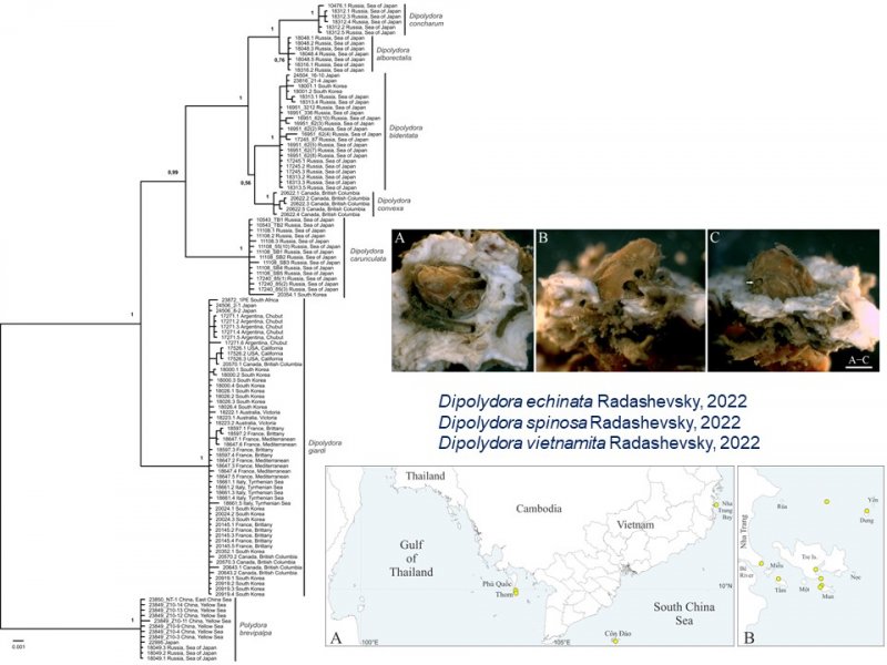 Давно сложившееся плодотворное сотрудничество зоологов и генетиков было отражено также в трех представленных результатах, посвященных исследованию морских червей-полихет, немертин и брюхоногих моллюсков. Было показано, что международное судоходство и перемещение коммерческих моллюсков (в основном устриц) - это ключевые процессы, которые привели к глобальному распространению полихет рода Dipolydora, сверлящих раковины и вредящих марикультуре.