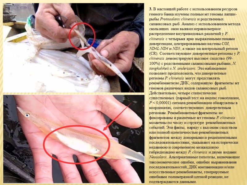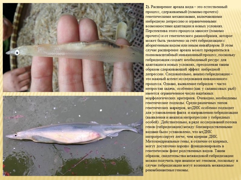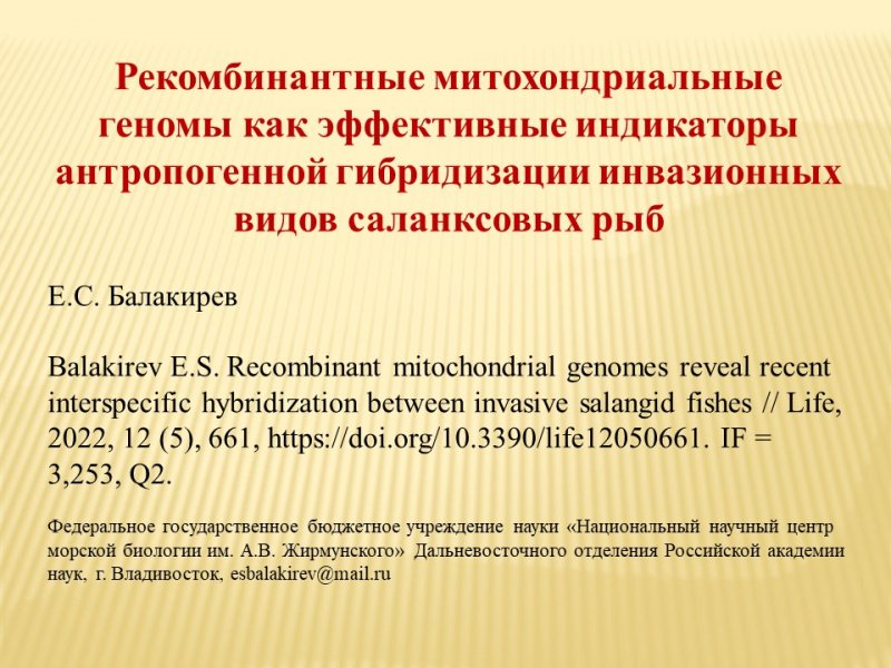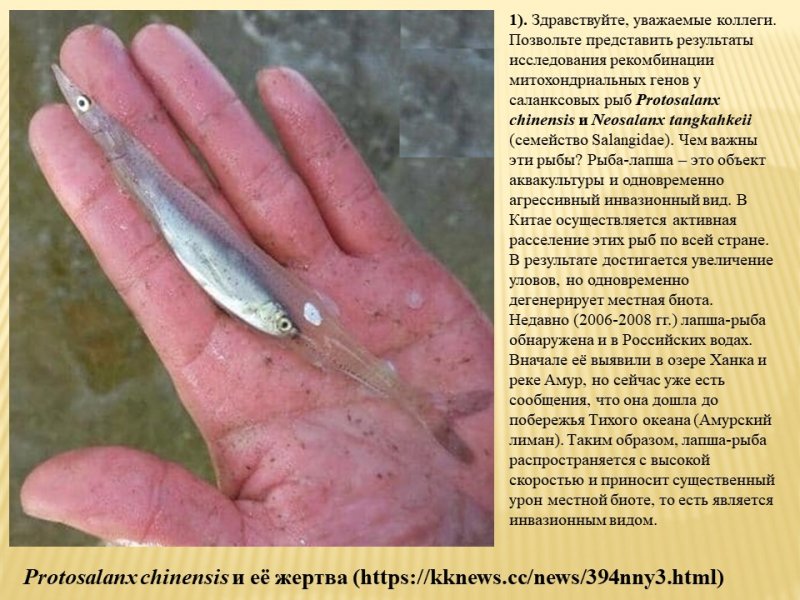 Ведущий научный сотрудник Лаборатории ихтиологии д.б.н. Е.С. Балакирев представил исследования межвидовой гибридизации инвазионных видов саланксовых рыб (семейство Salangidae), которые показали антропогенный характер этой гибридизации, обусловленной преднамеренной интродукцией видов. В связи с этим предложены диагностические маркеры для идентификации гибридов и мониторинга инвазионной динамики этих рыб.