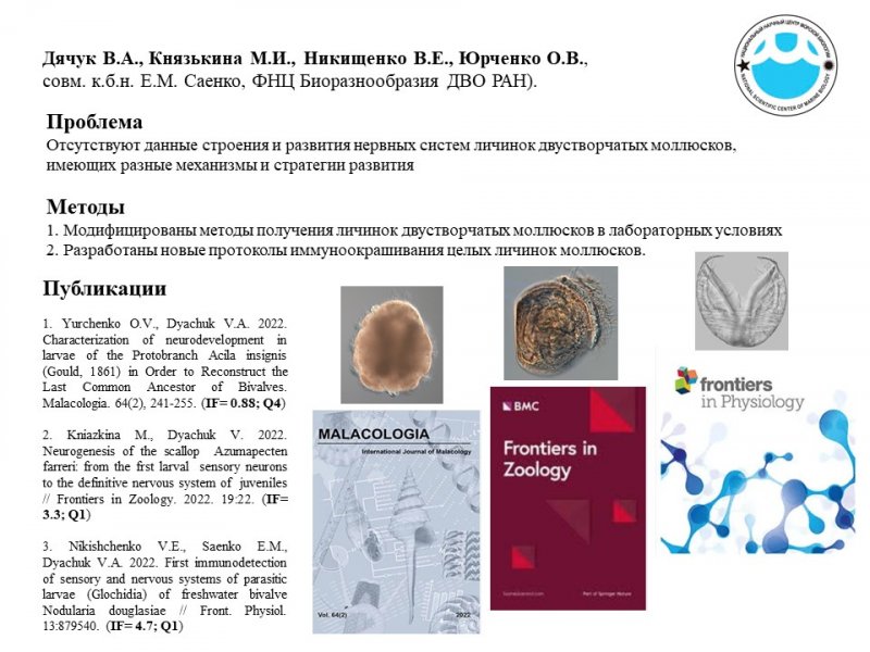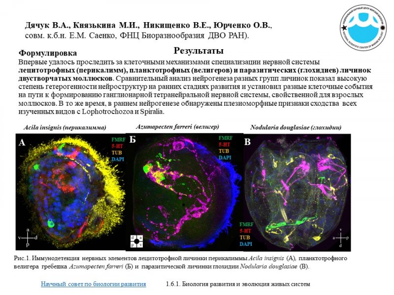 Коллективу авторов, руководимым ведущим научным сотрудником В.А. Дячуком, впервые в мире удалось детально проследить нейрогенез лецитотрофных (перикалимм), планктотрофных (велигеров) и паразитических (глохидиев) личинок двустворчатых моллюсков Полученные данные о развитии личиночных нервных систем помогут в решении не только фундаментальных эволюционных вопросов, но также будут полезны для разработки и развития современных методов марикультуры.