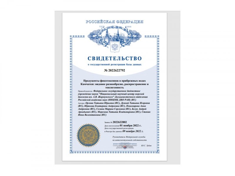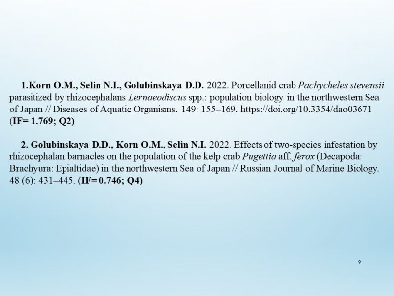 | 4 | 5 | к.б.н. Орлова Т.Ю., к.б.н. Селина М.С., к.б.н. Морозова Т.В., к.б.н. Стоник И.В., к.б.н. Ефимова К.В., к.б.н. Карпенко А.А., совместно с ИАПУ ДВО РАН, КамчатНИРО, ДВФУ и Университетом Токио, Япония. | 4,23 |