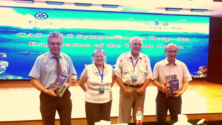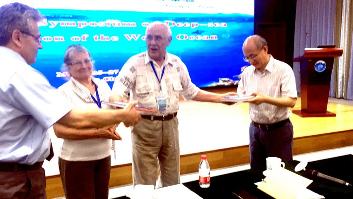 Э.А. Титлянов и Т.В. Титлянова дарят свои книги (E.A. Titlyanov, T.V. Titlyanova, Li Xiu Bao, Huang Hui «Coral Reef Marine Plants of Hainan Island» (на английском) и Li Xiu Bao, T.V. Titlyanova, Huang Hui, E.A. Titlyanov «Морские растения коралловых рифов залива Санья») президенту РАН Сергееву А.М. и вице президенту КАН Yaping Zhang на последнем заседании (26 марта 2019 г.) «CAS-RAS Symposium on Deep-water Exploration of the World Ocean» в г. Санья, Хайнань, Китай.